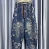 Damen Frühling Outfit Denim Patchwork Stickerei Weitbein Hose Lässig Retro Locker Damen Haremshose