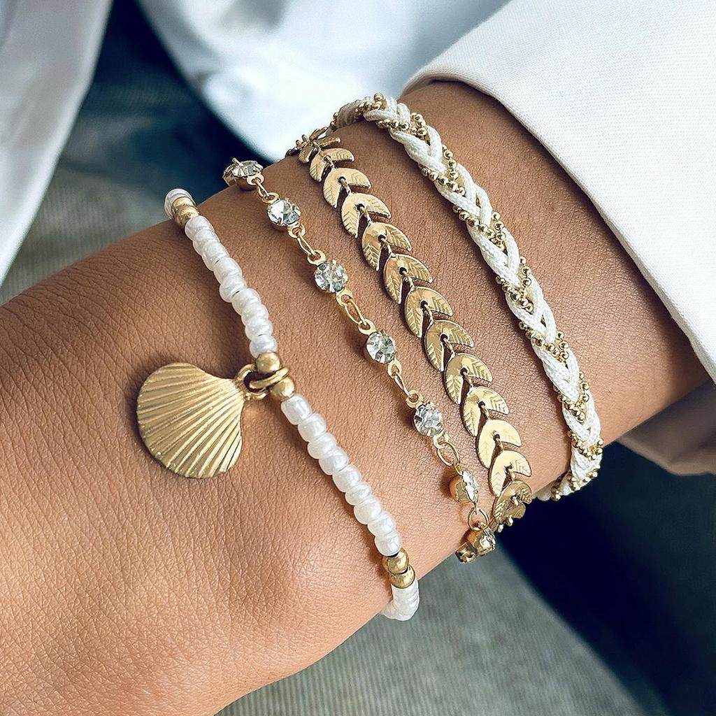 Grenzüberschreitender Schmuck, Reiskörnerperlen, Perlenketten, Geflochtene Seile, Muscheln, Geometrische Diamantbesetzte Blätter, Mehrschichtiges Armband-Set