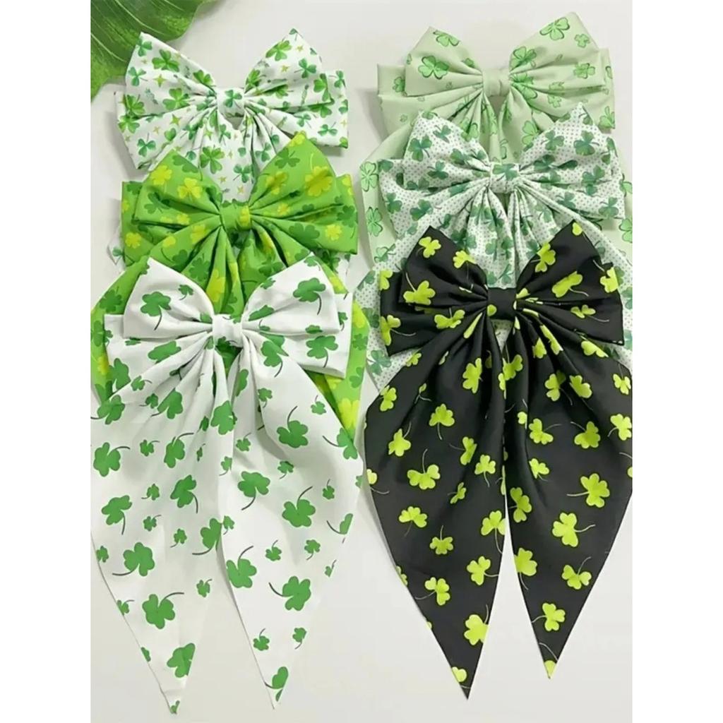 6-teiliges Set neu grün vierblättriges Kleeblatt Druck Schleifenband Streamer Federklemme Elegante Haarspange Frühling Haarschmuck