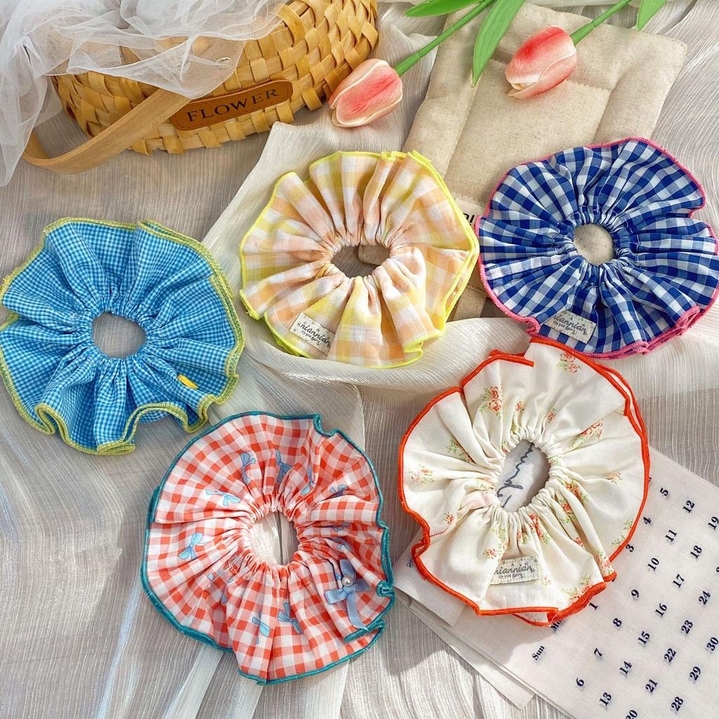 1 Stück süßes Mädchen kontrastierendes Karomuster doppelter Darmring, koreanische florale Schleife, großer Darm Haarring, Bälle Haarseil Kopfschmuck