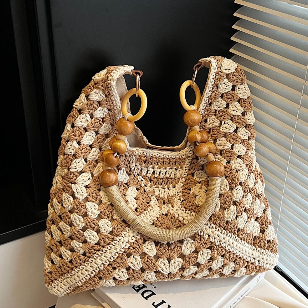 Stricktasche mit großer Kapazität Damen Sommer Neue Holzperlen Gewebte Umhängetasche Wolle Häkel-Einkaufstasche