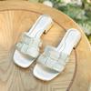 Vintage Kunst gewebte flache Hausschuhe Damen Außen dicker Absatz niedriger Absatz Strandschuhe eckige Sandalen