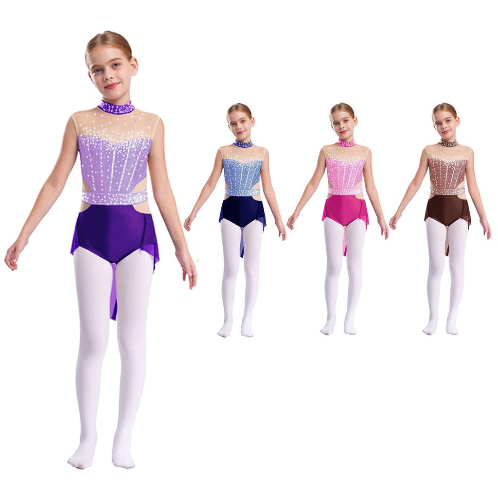 Mädchen Glänzender Lyrischer Tanz Trikot Stehkragen Ärmellos Strass Farbblock Mesh Rock Performance Kostüm