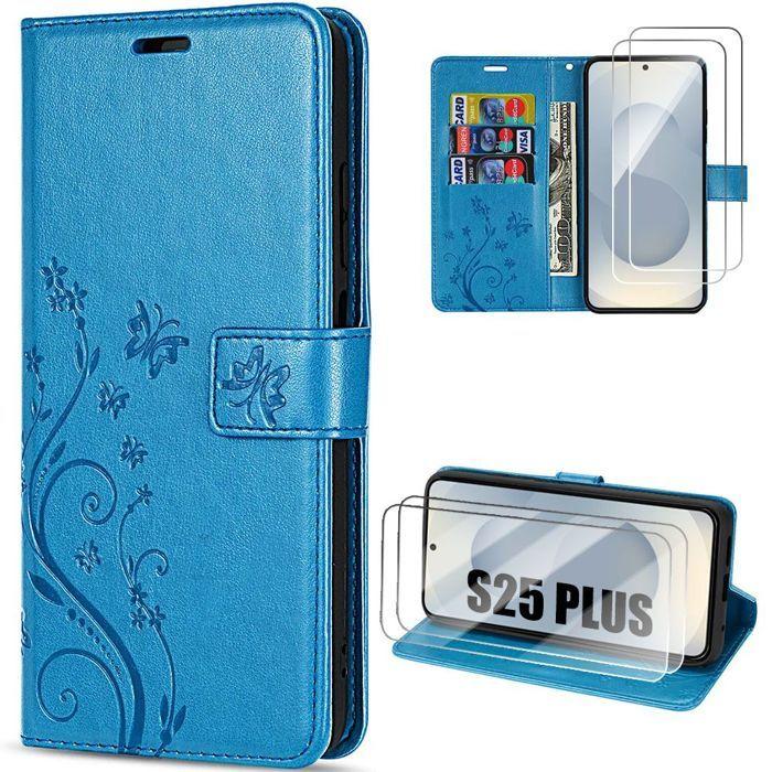 Hülle für Samsung Galaxy S25 Plus (S25+) - BOOLING - Synthetisches Leder Blau Blumenmuster Schmetterling - 2 Gehärtete Gläser