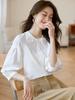 Damen Schickes Weißes Französisches Sieben-Ärmel Schlankmachendes Hemd mit Hohlstickerei - Sommer 2025 Kollektion