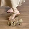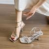 Sommer neue eckige Zehenpartie offene Riemen leere hohe Absätze Ein-Wort-Schnalle Gürtel gold außen modische Sandalen Damen