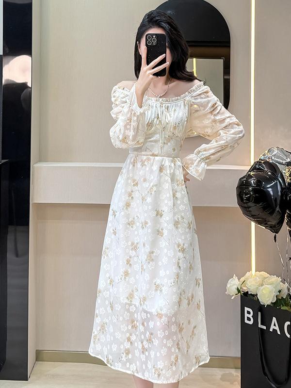French Ruffle Lotus Sleeve Floral Midi Dress - One-Shoulder, Two-Way Jacquard Print