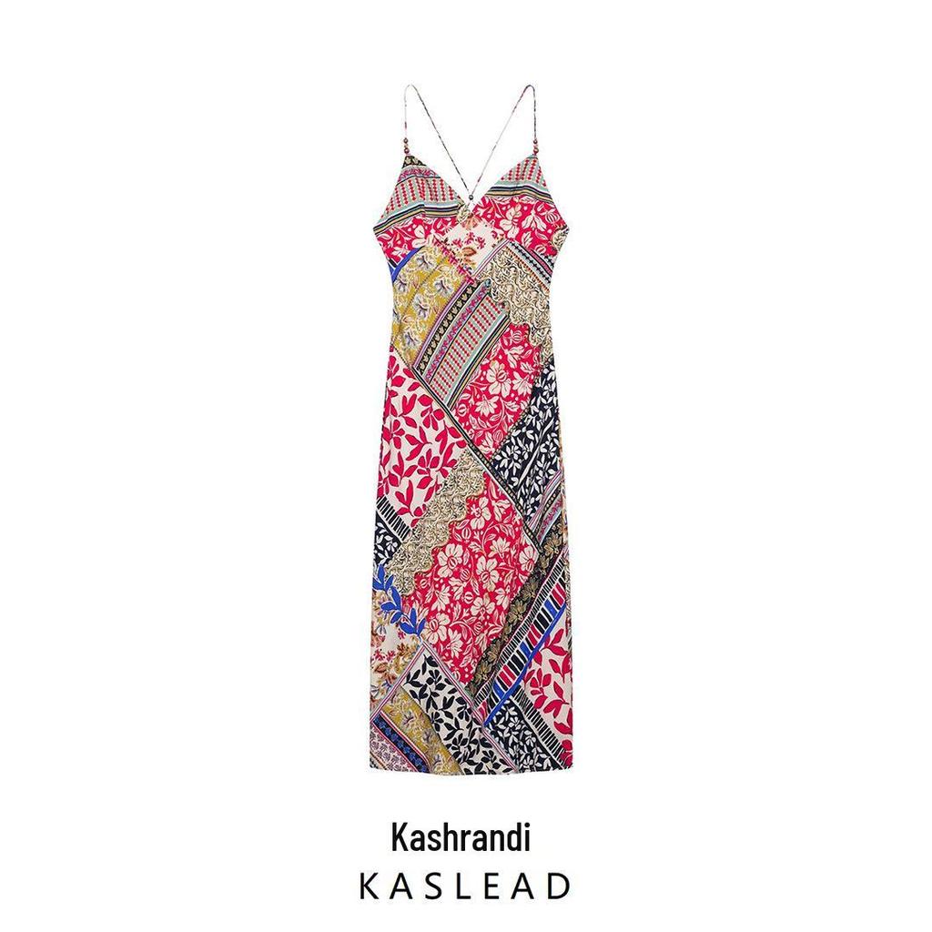 2025 Spring Women's Spaghetti Strap Print Midi Dress - European & American Style Fashion