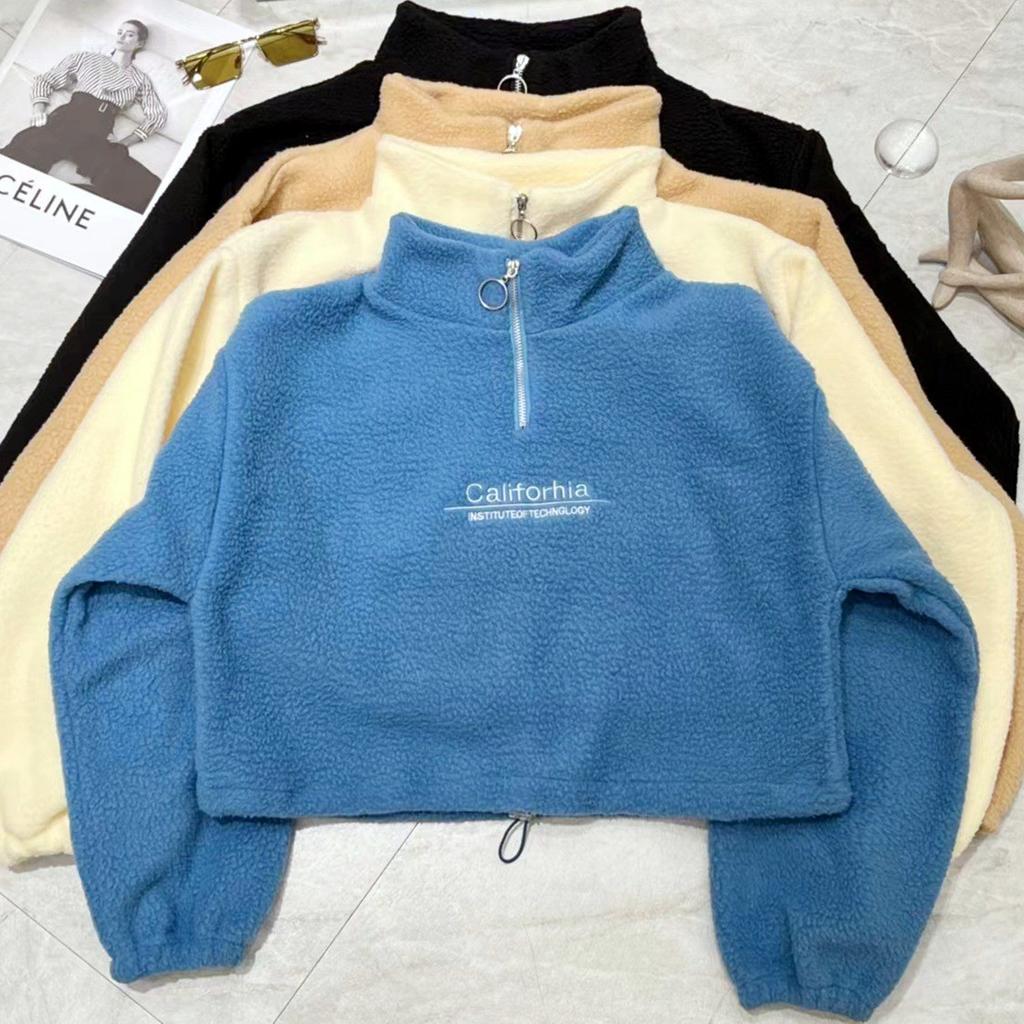 Verdicktes Lammvelours Herbst und Winter Kurzes Halbrollkragen-Reißverschluss-Sweatshirt für Damen Neues Plüsch Plüsch Verdicktes Lockeres Studenten-Oberteil