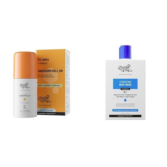 Chemist At Play Achsel Roll-On Deodorant mit 5% AHA, Milchsäure & 1% Mandelsäure Vegan| 40ml Feuchtigkeitsspendendes Duschgel für Frauen & Männer | 236ml