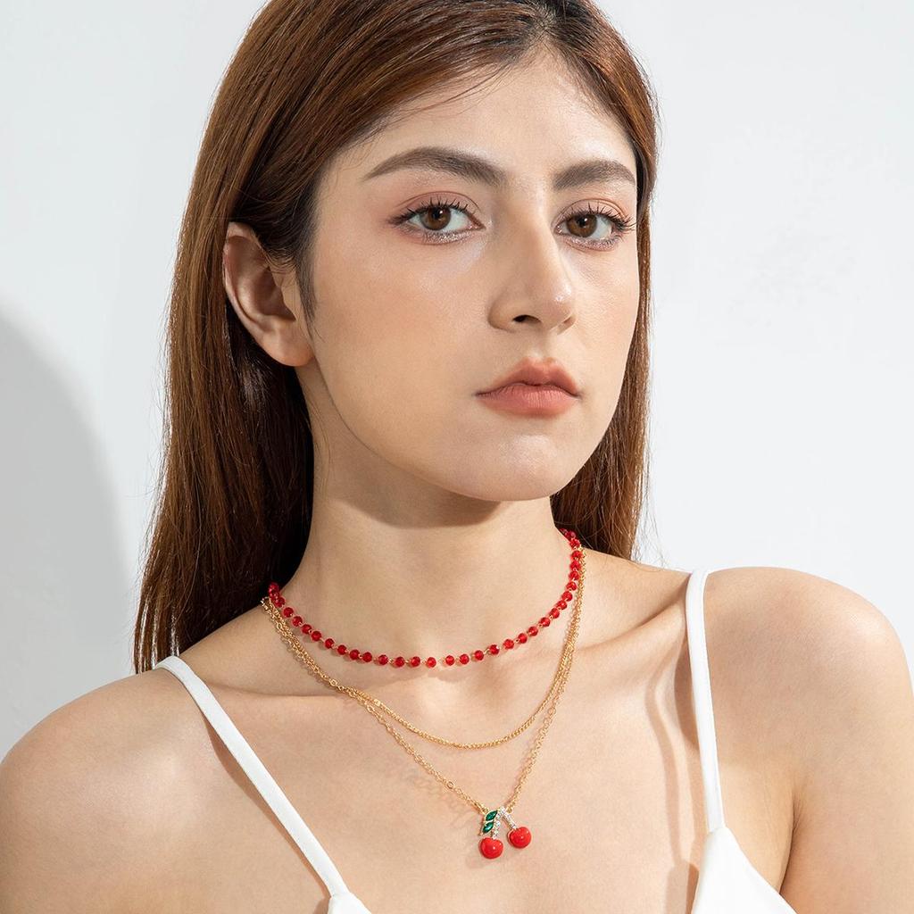 Grenzüberschreitendes rotes Reisperlen-Perlen mehrlagiges Halskettenset mit Strasssteinen Kirsche Kirschen Anhänger Halskette dreiteiliges Set