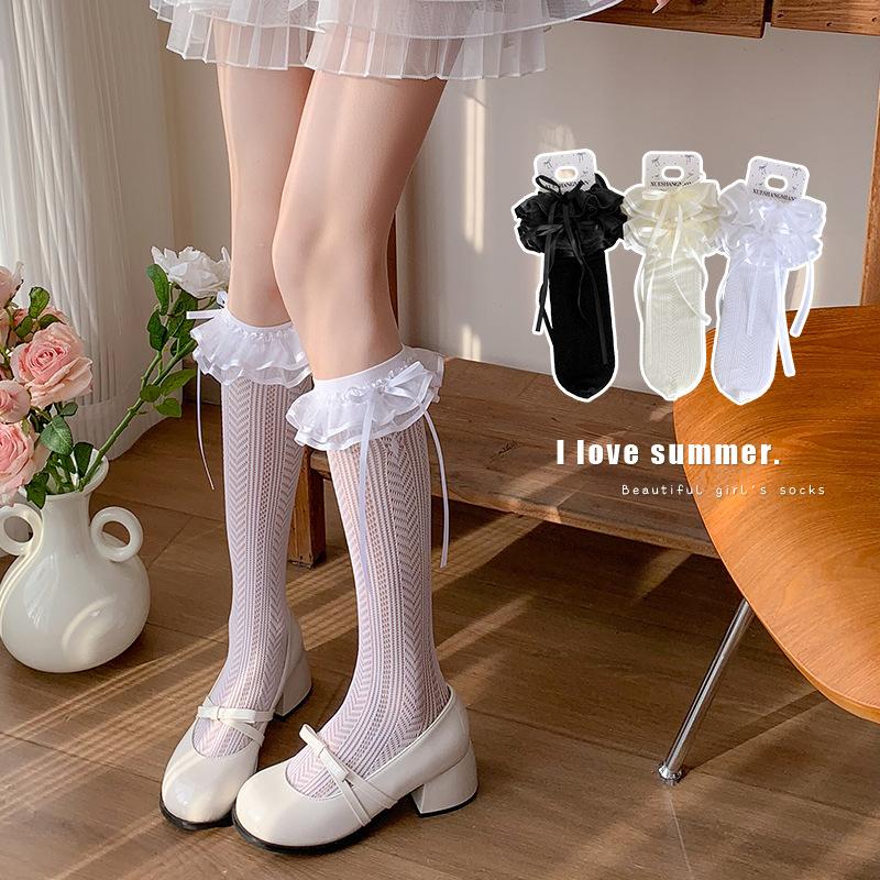 Spring and Summer Thin Lolita Lace Bow Calf Socks, Ballet-style Gauze Belt Thin White Mid-calf Pile Socks