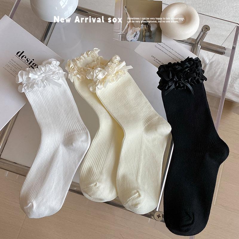 Lolita Spitzensocken mit Schleife Mid-calf sind süß und stilvoll für Frühlings- und Herbstmädchen. Die weißen flauschigen Baumwollsocken sind vielseitig