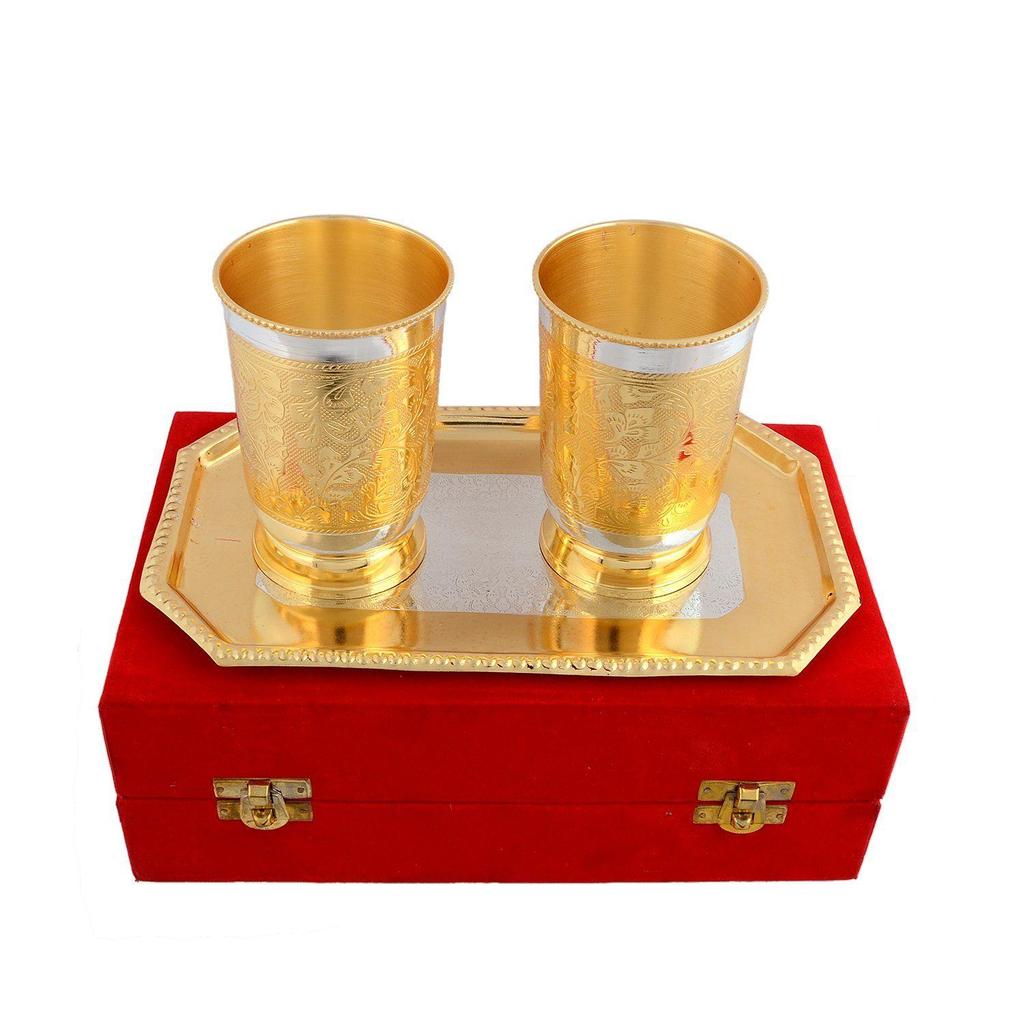 Silber Gold Plated Messing Glas für Trinkwasser Set mit Tablett | Set of 3 | Glasbecher 660 ml| Bestes Geschenk für Hochzeit, Jahrestag