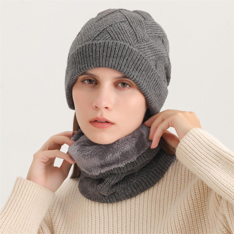 Solid color simple velvet thickened autumn and winter scarf scarf women's two-piece set warm knitted pullover hat windproof brimless hat