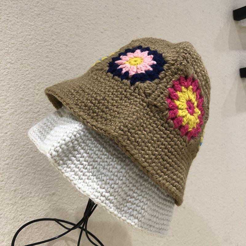 Handgestrickter Blumen-Bucket-Hat für Damen, Herbst und Winter, vielseitig, großer Kopfumfang, Retro-Waschbeckenhut, Nischen-Wollhut