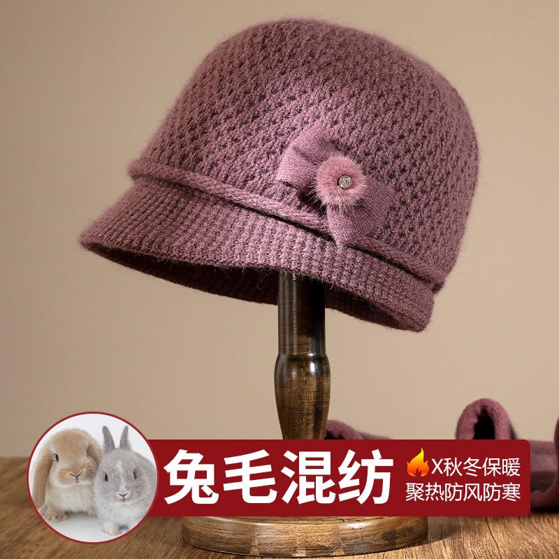 Middle-aged rabbit fur knitted hat Winter mother-in-law versatile wool hat Fleece thickened old lady thermal hat