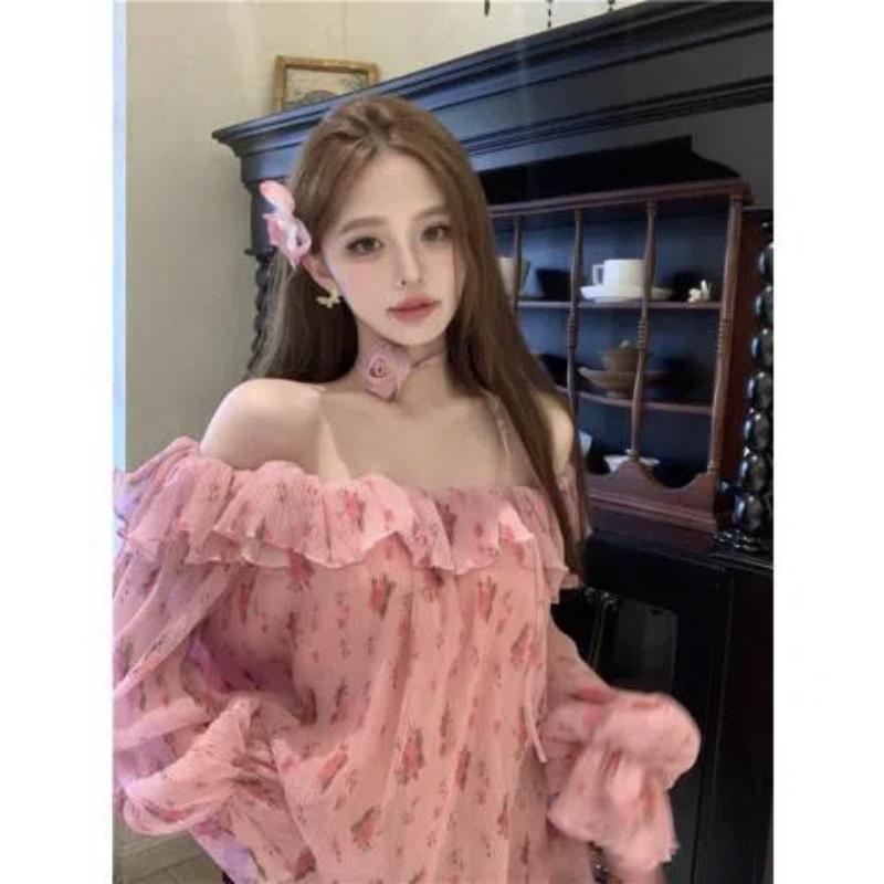 Blumiges Chiffonhemd Damen Ein Schulter Neckholder Top Glockenärmelhemd