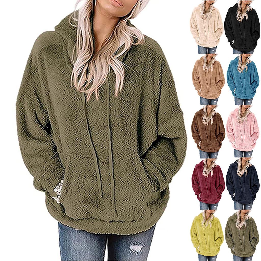 Lässiger Damen-Pullover, warmer Plüsch-Hoodie-Mantel, einfarbig, lockerer Taschenmantel