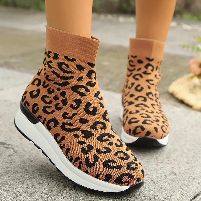 Leopard Printed Knitted Socks Sneakers for Women Breathable Casual Sports Running Shoes Woman Fashion High Top Slip-On Sneakers