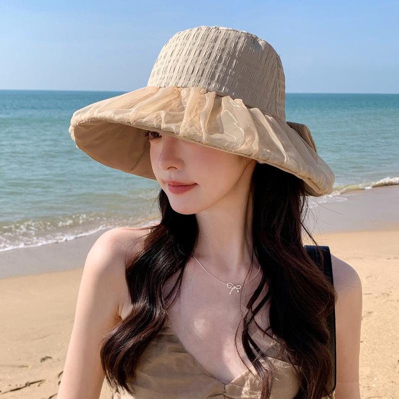 Summer new hat women's sunshade sunscreen bow bucket hat breathable mesh seaside beach sun hat