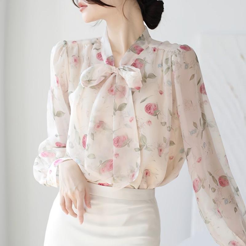 Leichte Fliege im französischen Stil, trendige Chiffonbluse, Damen Herbst Puffärmel Oberteil