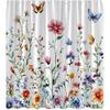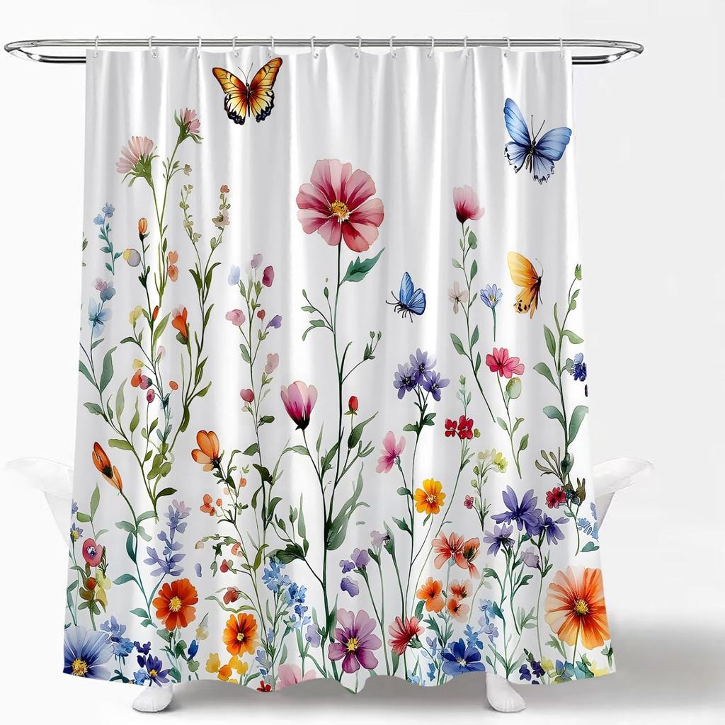 Spring Floral Leaves Shower Curtain Butterfly Watercolor Blossoming Flower Rustic Plant Nature Wildflower Vintage Country Farmhouse Fabric Curtain