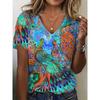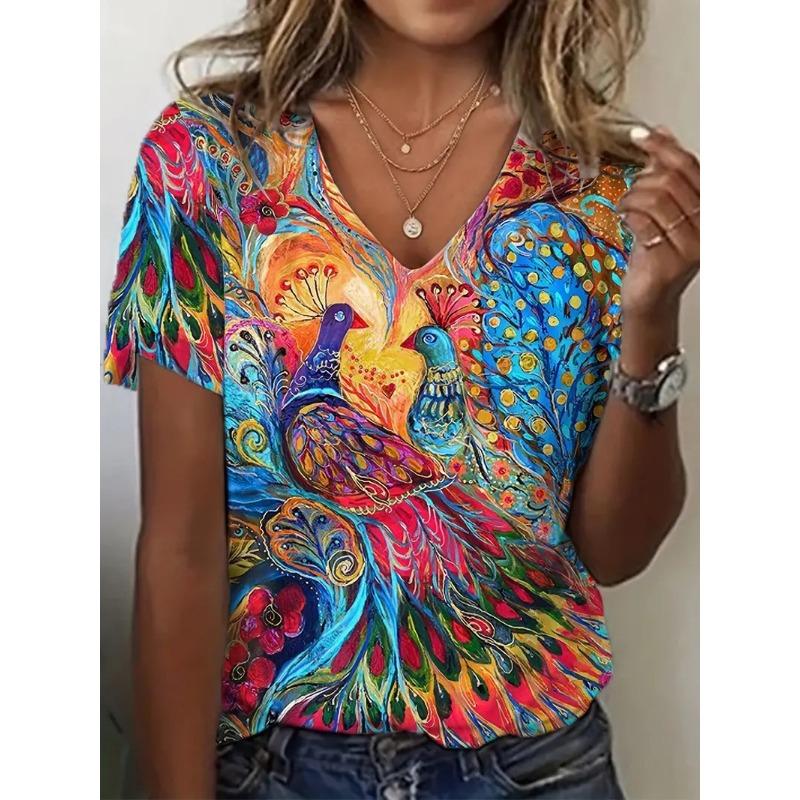 Sommerliches V-Ausschnitt-Top mit 3D-Tier-Phönix-Muster, modisches, lässiges Kurzarm-T-Shirt für Damen