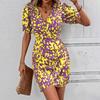 Women's Short Summer Dresses Casual Painted Prints Puffy Sleeve Wrap V Neck Dress High Waist Trendy Print Wrap Hem Beach Dress