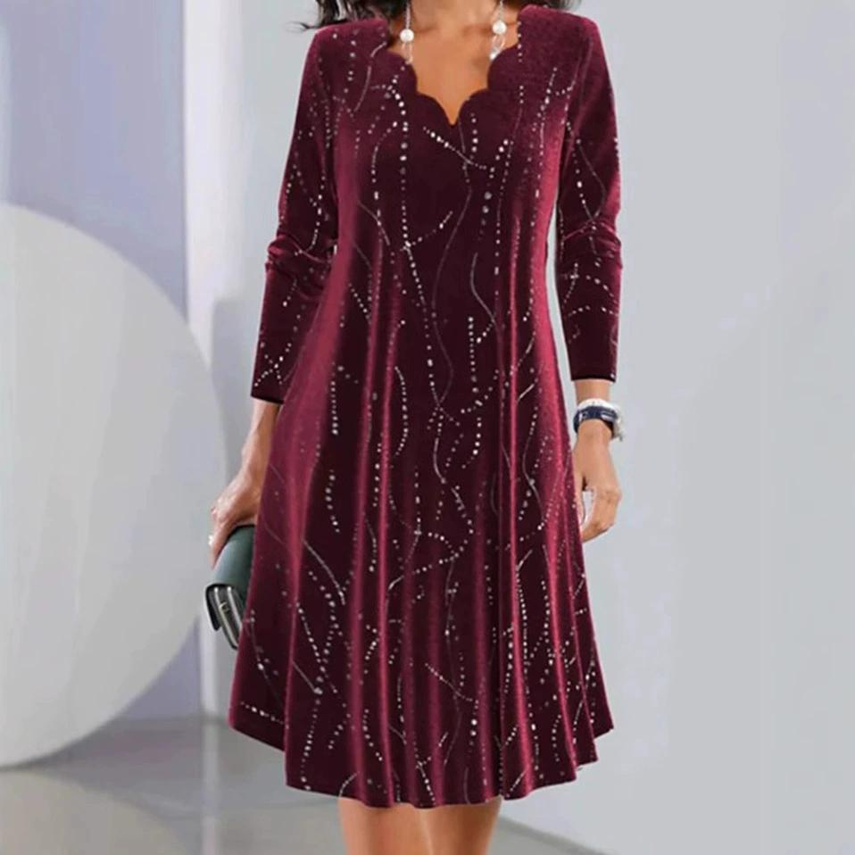 Women's Midi Dress Flower Edge V Neck Long Sleeve A Line Dress Loose Sequin Pullover Knee Length Party Dress