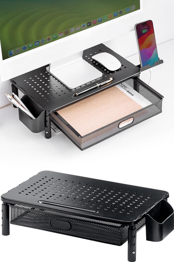 Monitor Smartphone Width Depth 3 Height Load Capacity E-Supply Stand, Drawer, A4, Stand, 37cm, 23.5cm, Adjustments, Steel, 15kg, Compact, Black,