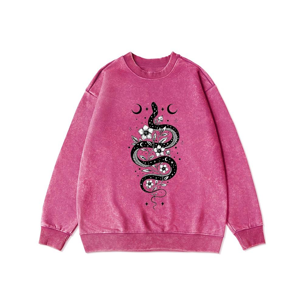 Mond- und Schlangenmuster Damen Gewaschener Dünner Stil Sweatshirt Lockerer Hoodie Herbst Lässig Baumwolle Basic Oberteile