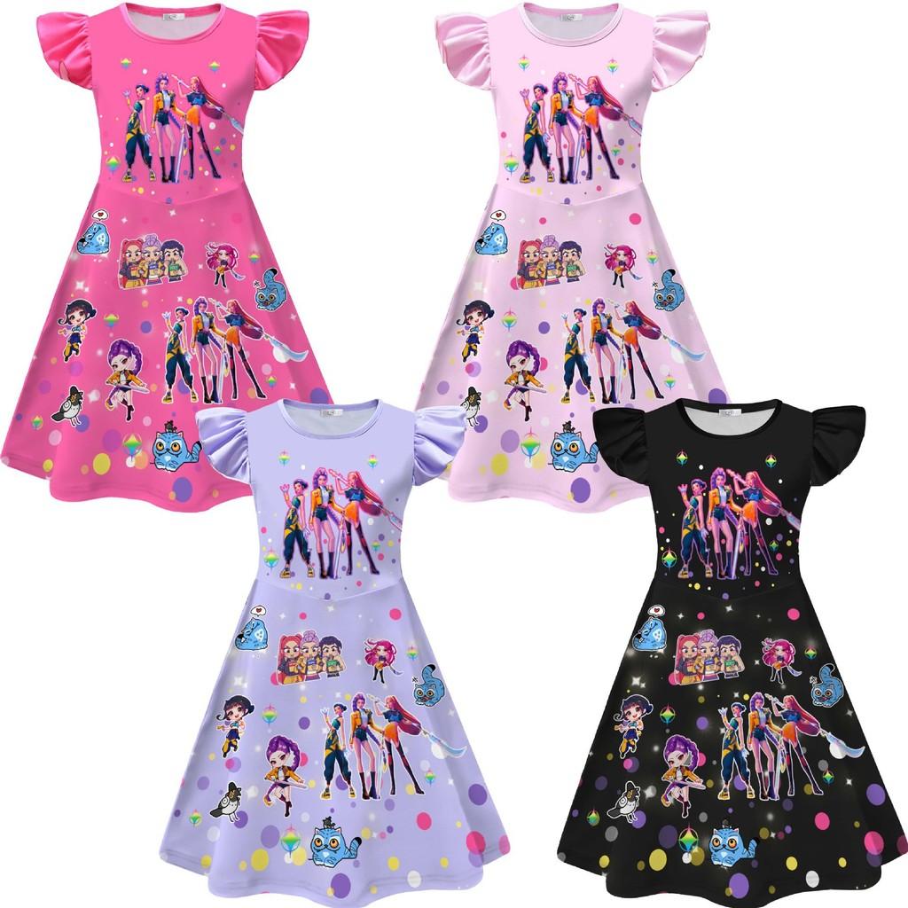Kinder Mädchen Anime Cartoon K-Pop Dämonenjäger Aufdruck Rüschenärmel O-Ausschnitt Freizeitkleid Halloween Cosplay Kostüme