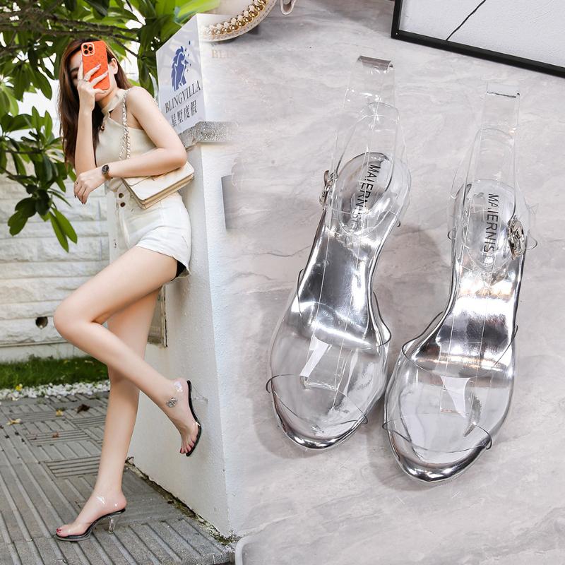 Neuer Stil und modische Internet-Berühmtheit Kristallabsatz Transparentes Kreuzband Mittelabsatz Sandalen mit offener Zehenpartie Übergröße Alltagskleidung