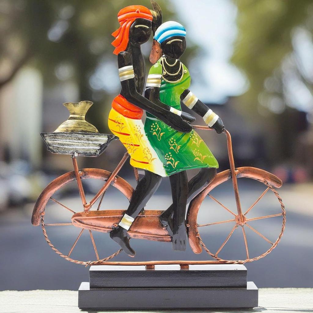 Handcrafted Ethnic Tribal Bicycle Couple Showpiece - 16x13 Inch Tribal Home Décor with Wooden Base for Housewarming, Anniversaries