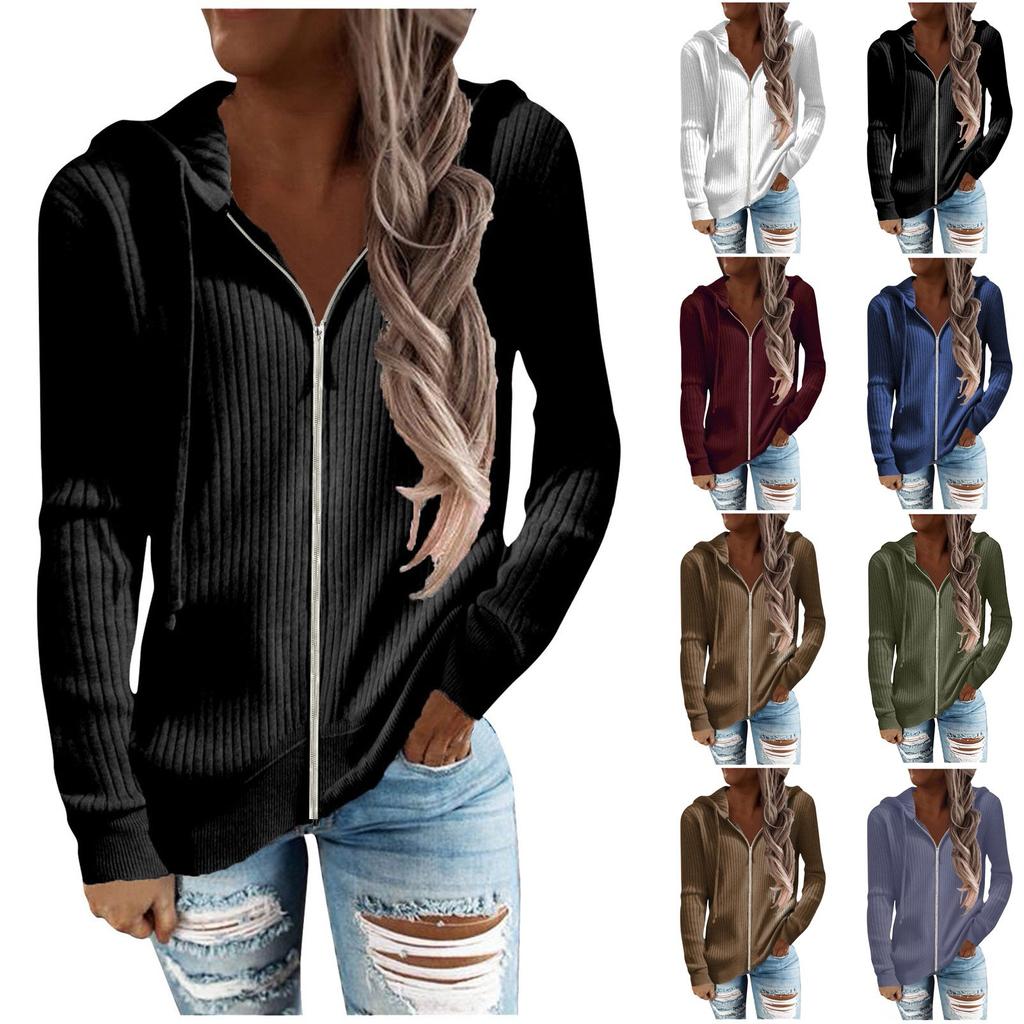 Langarm-Cardigan mit offener Vorderseite für Damen, lässiger Strick-Sweatshirt-Mantel mit Kapuze und Reißverschluss