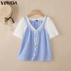 VONDA Women Short Sleeve Lace Crochet Hollow Patchwork Plaid Casual Blouse