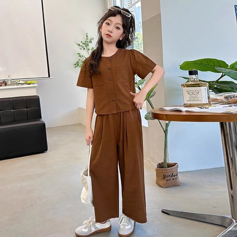 Sommer-Set für Mädchen Kurzarm-Oberteil Weitbein-Hose Mädchen Baumwolle und Leinen Zweiteiler Dünnes Sommer-Outfit