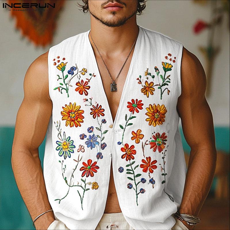 INCERUN Men Sleeveless Floral Print Button Casual Loose Tank Tops