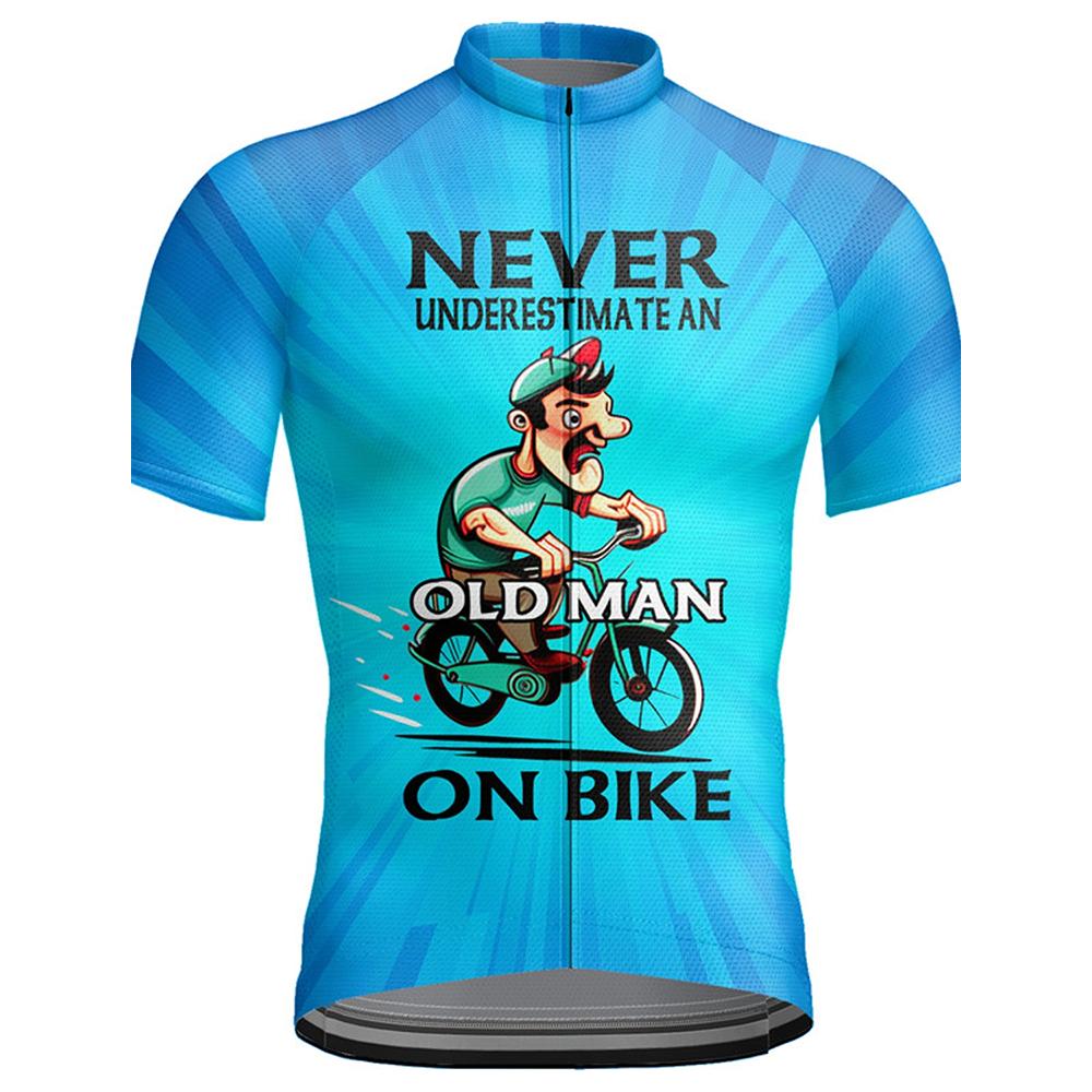Herren Blaues Radtrikot mit Grafik "Unterschätze niemals einen alten Mann auf einem Fahrrad" - Kurzarm, Reißverschluss, Schnelltrocknend, Sonnenschützende Outdoor-Sportbekleidu