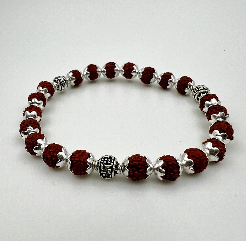 Traditionelles hinduistisches Rudraksha-Perlenarmband mit silbernen Abstandshaltern, Spirituelles Energiearmband, Traditioneller hinduistischer Schmuck