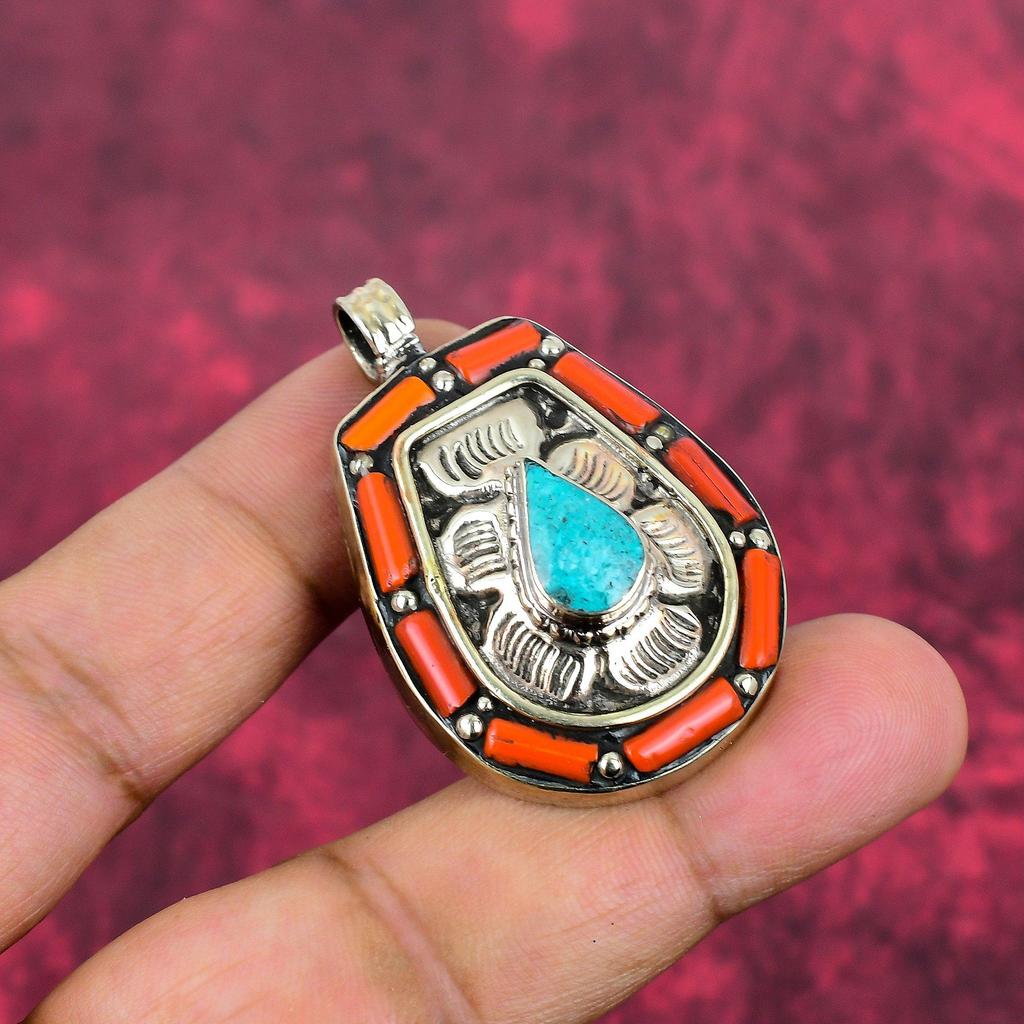 Koralle & Türkis Anhänger, Edelstein 925 Massiv Sterlingsilber Schmuck Nepalesischer Anhänger, Handgefertigter Schmuck Geburtssteinanhänger, Geschenk für Ihn