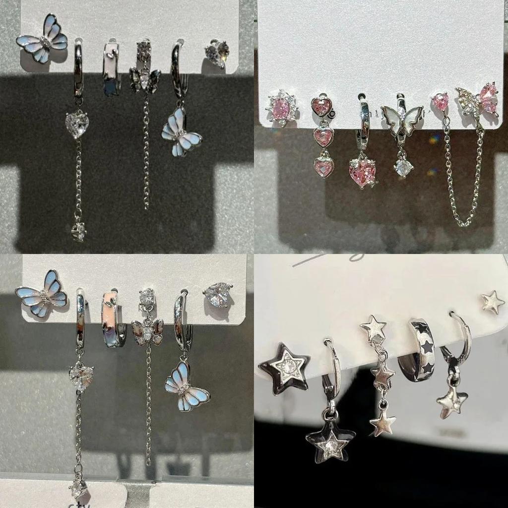 6tlg./Set Gothic Punk Kristall Stern Mond Anhänger Ohrring Set Damen Vintage Stecker Ästhetik Grunge Trendy Y2K Zirkon Accessoires