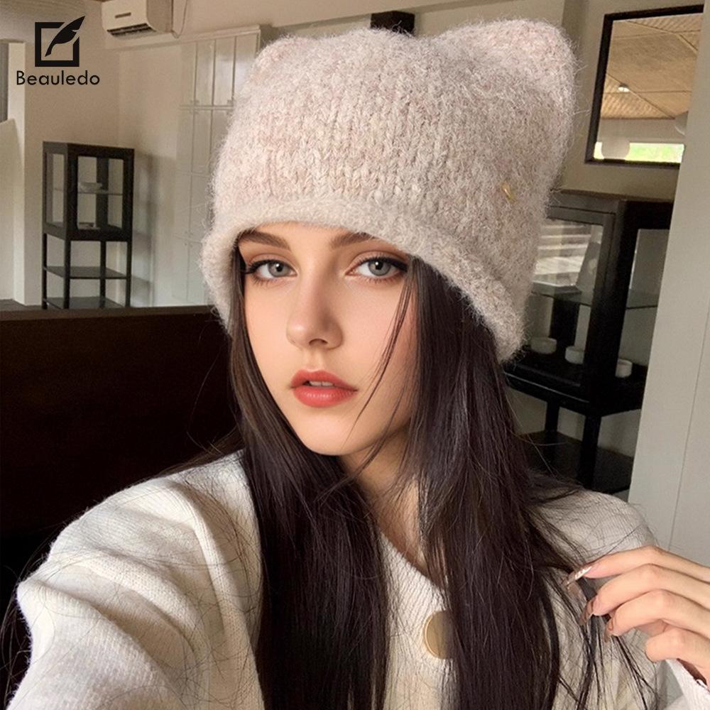 Niedliche Katzenohren Strickmütze für Damen Wollmischung Herbst und Winter Warm Vielseitiger Ohrenschutz Wollmütze Zeigt Gesicht