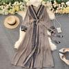 Damen Chiffon Maxikleid Bedruckt Schnürbund Langärmlig Schärpen Taille Vintage Swing Langes A-Linien-Ferienkleid
