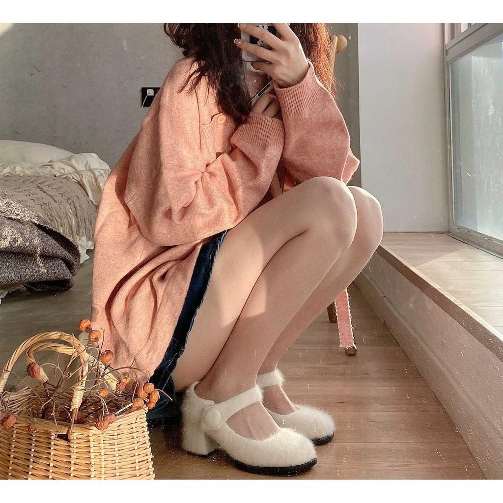 Herbst und Winter 2025 neue Samt warme Mary Jane High Heels runde Spitze dicker Absatz vielseitige flauschige Schuhe Damen ins Tide