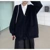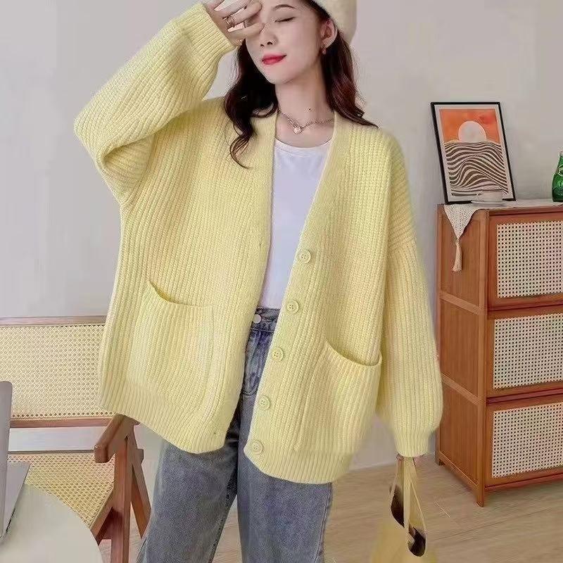 Loose and lazy wind V-neck sweater cardigan women's autumn and winter simple solid color versatile medium and long knitted jacket women