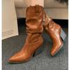 Mode Hohe Absätze Mid-Calf Plissierte Stiefel für Frauen Herbst Winter Braun PU Leder Westernstiefel Frau Dick Absatz Cowgirl Botas Mujer