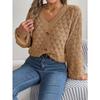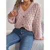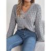 Herbst- und Winter-Freizeit-Pullover mit V-Ausschnitt, Knopfleiste, Lochmuster und Laternenärmeln, eleganter, lässiger grauer Damen-Strickpullover mit langen Ärmeln