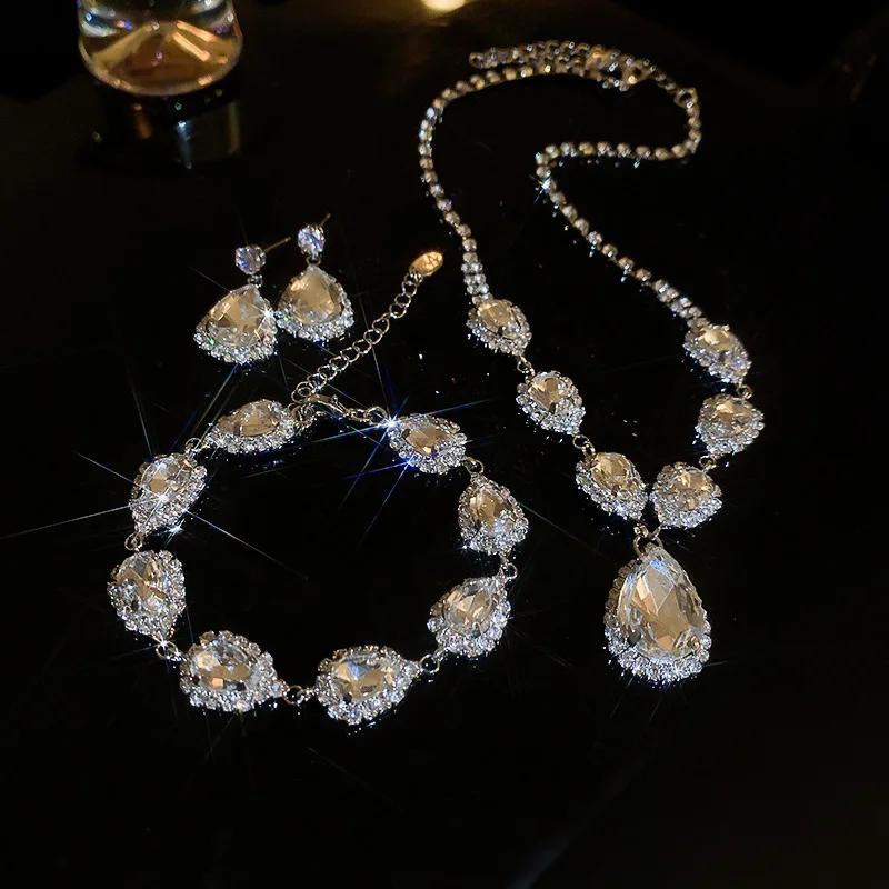 Übertriebenes eingelegtes Strass 2-teiliges Set Wassertropfen-Armband Geometrische Halskette Luxus-Ohrring Temperament Zirkon-Sets für Frauen